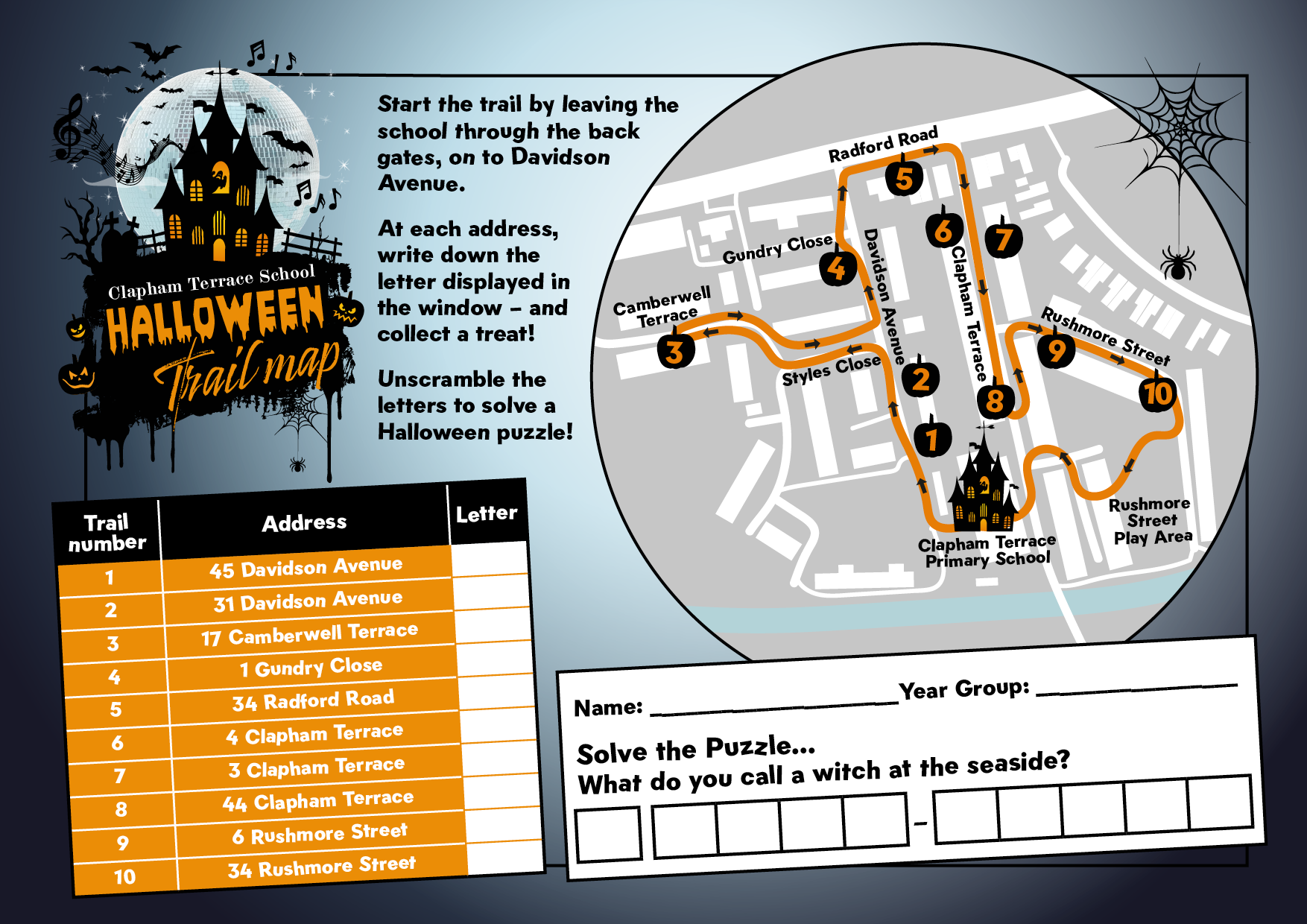 Loved getting spooky designing this Halloween disco poster and trail map for Clapham Terrace School.