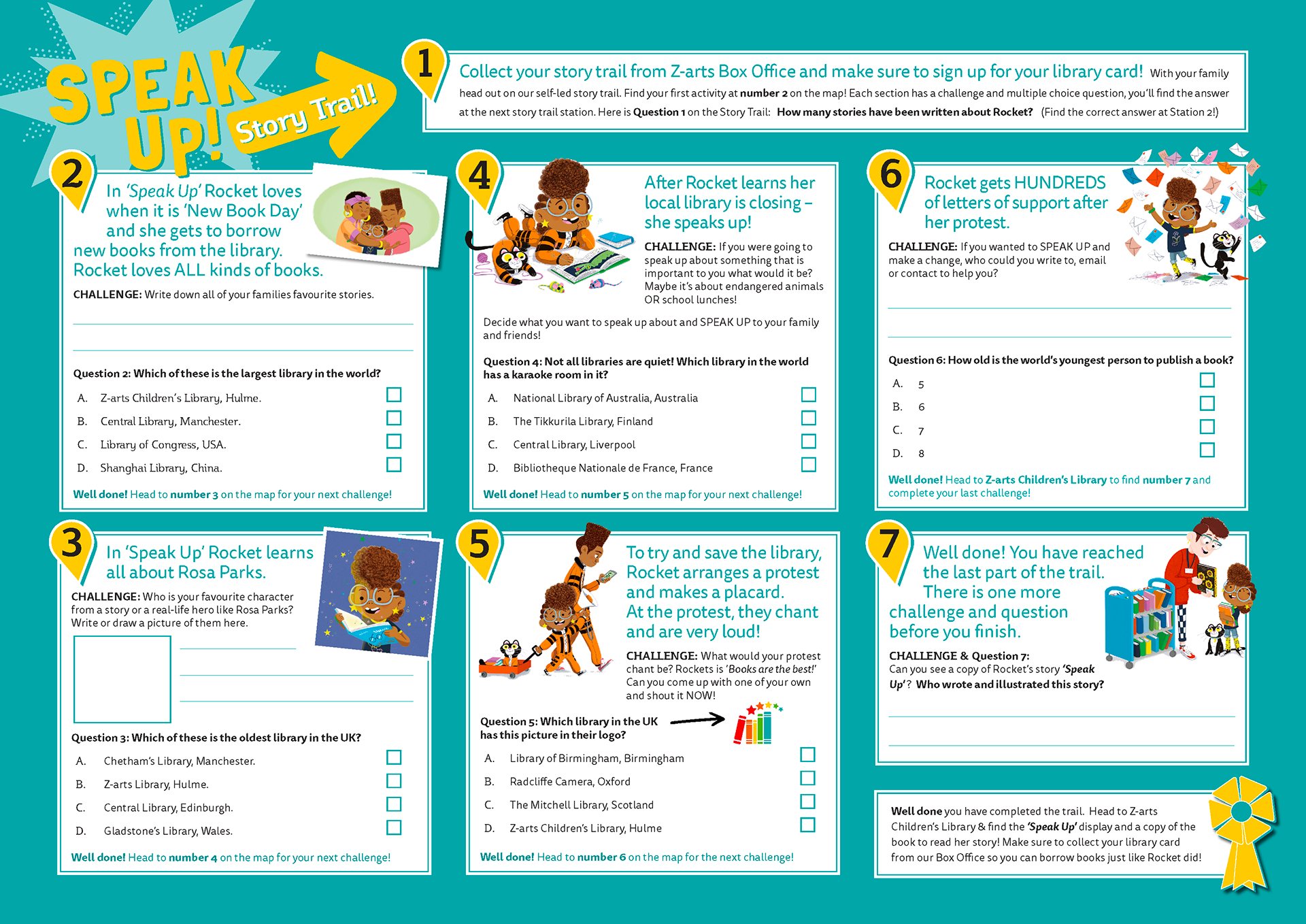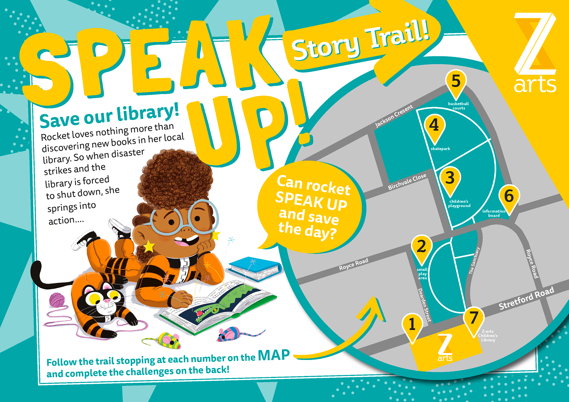 Family arts venue Z-arts asked me to design a story trail map and station cards for Speak Up! A beautifully written and illustrated story book for children by Nathan Bryon and Dapo Adeola.